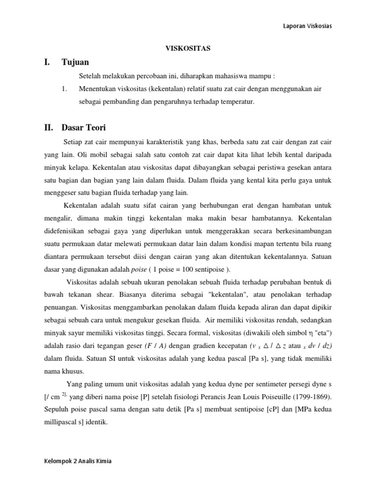 Iv empat asisten pembimbing. Laporan praktikum kimia fisik i percobaaan iv viskositas oleh. Teori 31 pengertian viskositas viskositas adalah suatu cara untuk menyatakan berapa daya tahan dari aliran yang diberikan oleh suatu cairan.